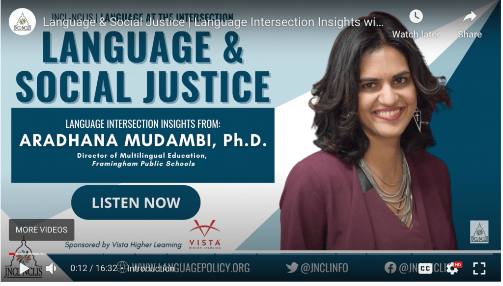 Dr. Aradhana Mudambi is the founder and executive director of multilingual education at Language & Equity Education Solutions LLC, a consulting firm that supports schools and school districts to build and improve their multilingual programming, including their Dual Language Education programs, through professional development, coaching, and consulting. Before opening Language & Equity, Dr. Mudambi started her blog Social for Justice and Education and taught several courses such as Intercultural Communications, TESOL Methods, and Assessments for Bilingual Students at Eastern Connecticut State University. She served as the Director of Multilingual Education at Framingham Public Schools in Massachusetts where she oversaw Dual Language programs in Spanish and Portuguese and worked as the Director of ESOL, Bilingual Education, and World Languages at Windham Public Schools, not only overseeing and restructuring Windham’s Two-Way Dual Language program: Compañeros, but also building from ground up Dos Ríos, New England’s first One-Way Dual Language program. Dr. Mudambi has served as a building leader, a Dual Language teacher, an ESOL teacher, and a Spanish teacher. She has worked in India, Mexico, France, England, and The United States. She has her doctorate from Harvard University. She can be reached at arm977@mail.harvard.edu.